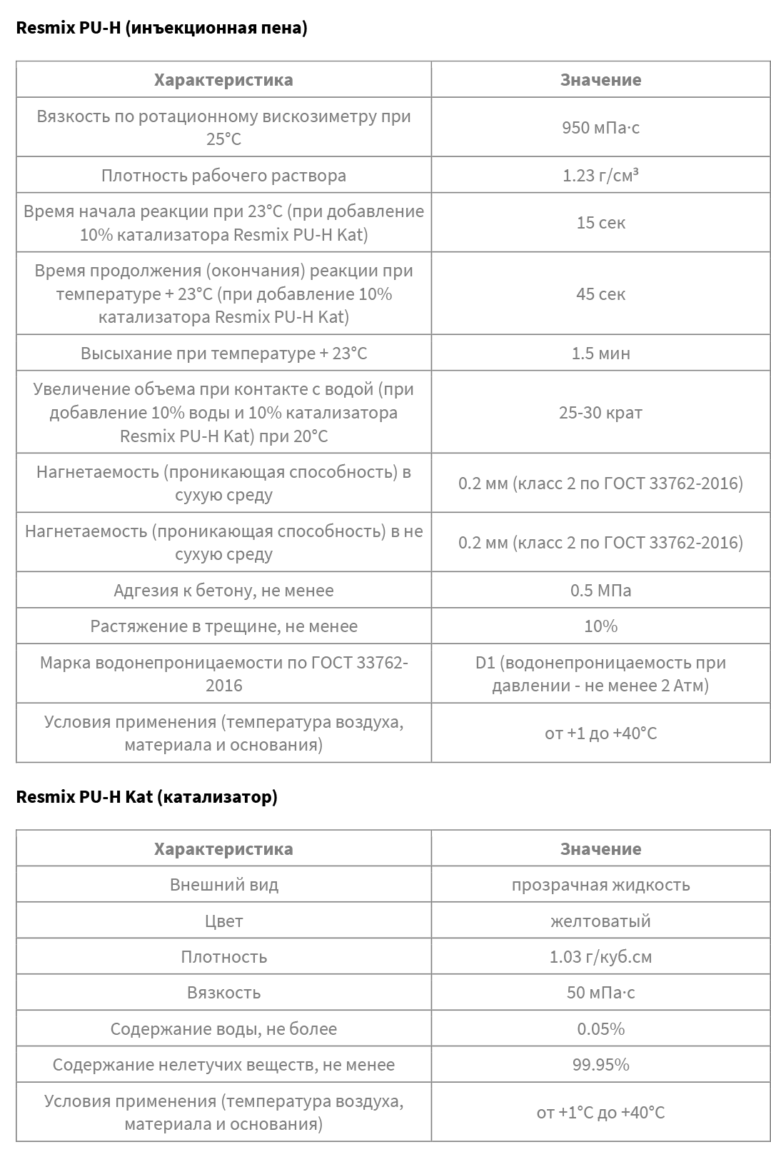 Работы с Resmix PU-H (инъекционная пена) следует выполнять при температуре поверхности конструкции от +3°С и до +35°С.